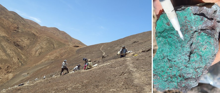 Oberflächliche Gesteinssplitterprobenahmen über 500 m auf Pampero verdeutlichen geochemische Anomalien von Kupfer mit Gehalten von bis zu 3,8 % und 4,0 ppm Silber als schwarze und grüne Kupferoxide (Kieselkupfer, Tenorit).