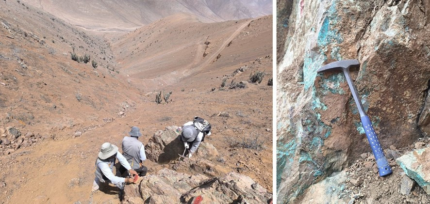 Photo 2. Left: Camino team sampling outcrops at Katty. Right: close-up of the sampling site, occurrence of green copper oxides (malachite-chrysocolla).