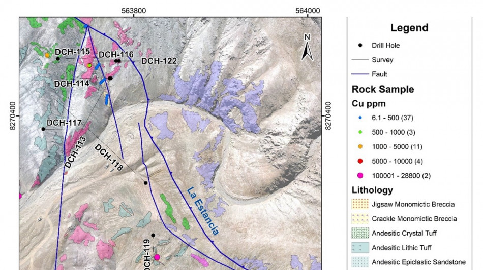 Copper oxides mineralized in the Pampero area have shown continuity at depth with geochemical results at drill hole DCH-118 with copper grades up to 0.5%, silver 3.15 ppm at a depth of 157.6 m following the main structural control.