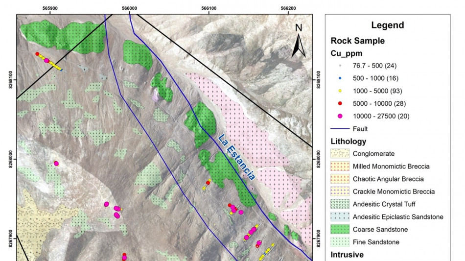 At Pampero, alteration and mineralization are controlled by the La Estancia fault and secondary north west and north south trending faults. This set of structures acted as feeders, while the volcanic rocks of the Chocolate Formation acted as receptors. Camino has been prioritizing their exploration in this volcanic sequence, which has the potential to host large-tonnage copper deposits. The program successfully identified or extended oxide copper mineralization northwest of the La Estancia fault, along the Pampero area (Figure 1).