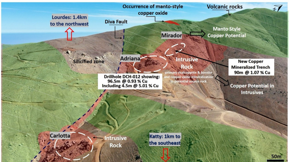 "The high-grade Mirador target has nice showings of bornite, adding to its high-grade results of 90 m at 1.07% Cu, including grades over 3% Cu. The mineralization is within intrusives, which could be the source mineralizing rock for all the copper at Los Chapitos. With a package of Chocolate volcanic rocks above this outcrop, it appears that the successful Adriana zone, could potentially be repeating itself. The recent 1:2000 scale mapping approach with Nittetsu has yielded key new targets," said Jose Bassan, consulting geologist.